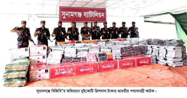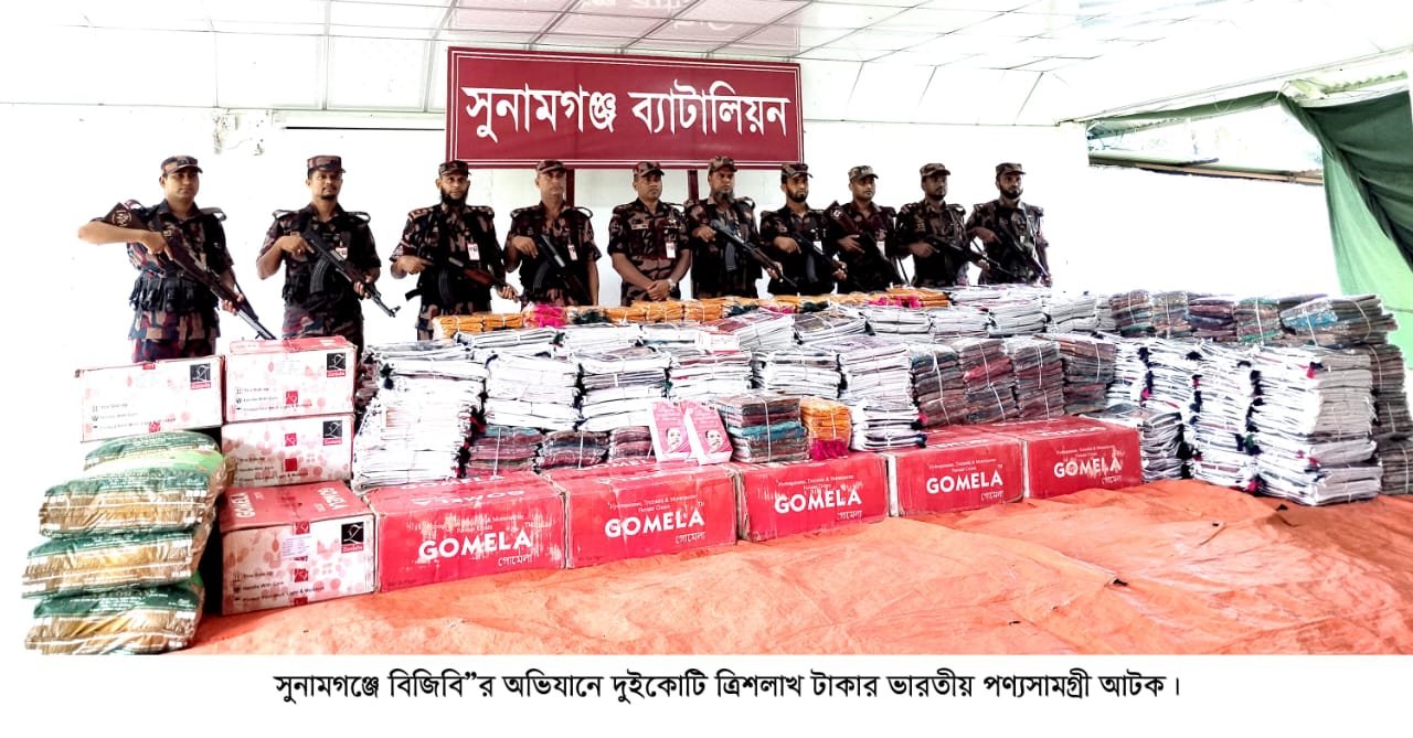 সুনামগঞ্জ সদর উপজেলার সুরমা ইউনিয়নের হালুয়ারঘাট এলাকায় অভিযান চালিয়ে প্রায় ২ কোটি ৩ লাখ ৬ হাজার টাকার ভারতীয় অবৈধ পণ্যসামগ্রী জব্দ করেছে ২৮ বর্ডার গার্ড ব্যাটালিয়নের (বিজিবি) সদস্যরা। রোববার ১ জুন ভোররাতে সুরমা নদীতে এ অভিযান পরিচালিত হয়।