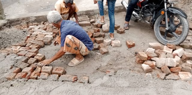 গত ৩ জুন (মঙ্গলবার) সরেজমিনে পরিদর্শনে দেখা যায়, আরসিসি রাস্তার কাজে ব্যবহার করা হচ্ছে পুরাতন, ভাঙা, নোংরা ও নিম্নমানের ইট। ১/২ ইঞ্চি গ্যাপ রেখে বালু ছাড়া ইট বিছিয়ে দেওয়া হচ্ছে। এ নিয়ে মিস্ত্রি বিভূতি লালের সঙ্গে কথা বললে তিনি দায় এড়িয়ে বলেন, “স্যারের সাথে কথা বলেন।”