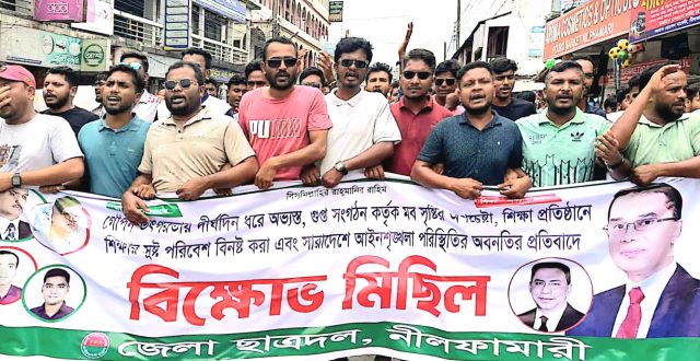 গোপন সংগঠনের মাধ্যমে মব সৃষ্টির অপচেষ্টা, শিক্ষা প্রতিষ্ঠানে শিক্ষার পরিবেশ নষ্ট এবং সারাদেশব্যাপী আইন-শৃঙ্খলা পরিস্থিতির চরম অবনতির বিরুদ্ধে প্রতিবাদ জানিয়ে বিক্ষোভ মিছিল করেছে নীলফামারী জেলা ছাত্রদল।