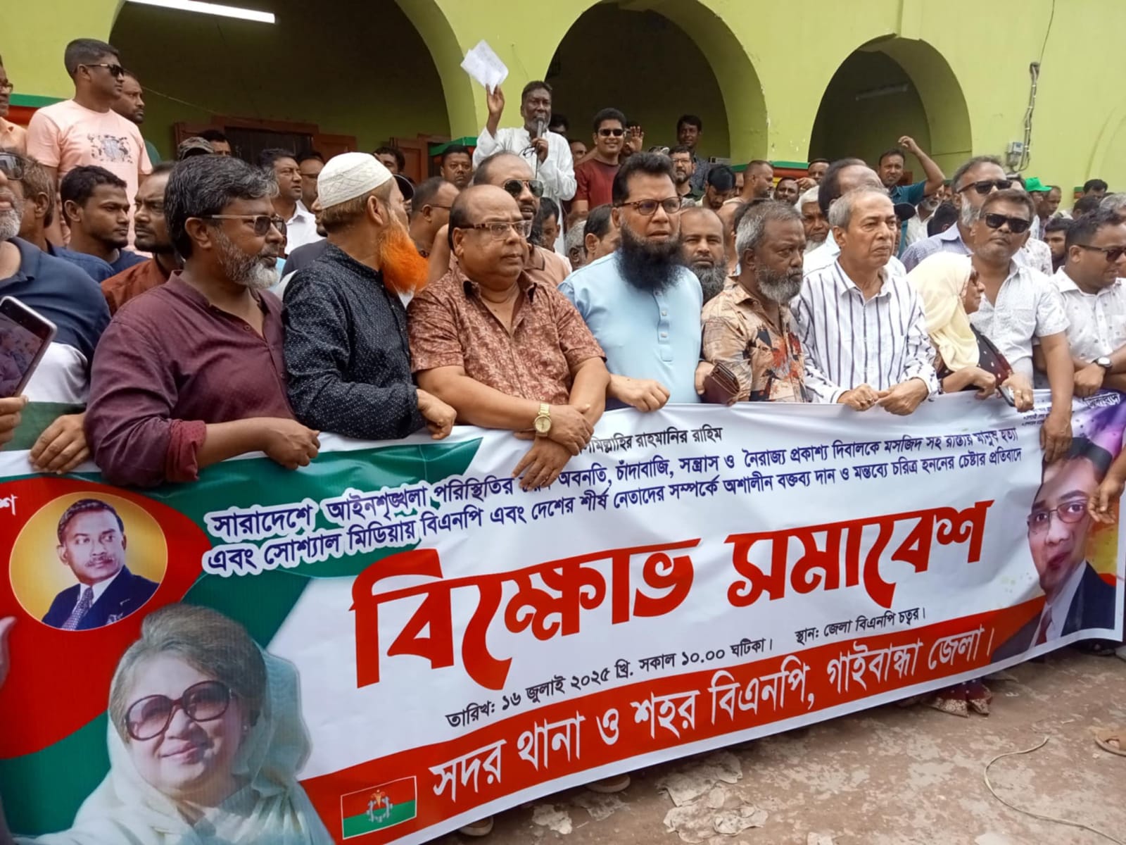 বুধবার (১৬ জুলাই) দুপুরে প্রবল বর্ষণের মাঝেও গাইবান্ধা সদর থানা ও পৌর বিএনপির যৌথ উদ্যোগে এই প্রতিবাদ কর্মসূচি পালন করা হয়। এতে শতাধিক নেতাকর্মী বৃষ্টিতে ভিজে সক্রিয়ভাবে অংশগ্রহণ করেন।