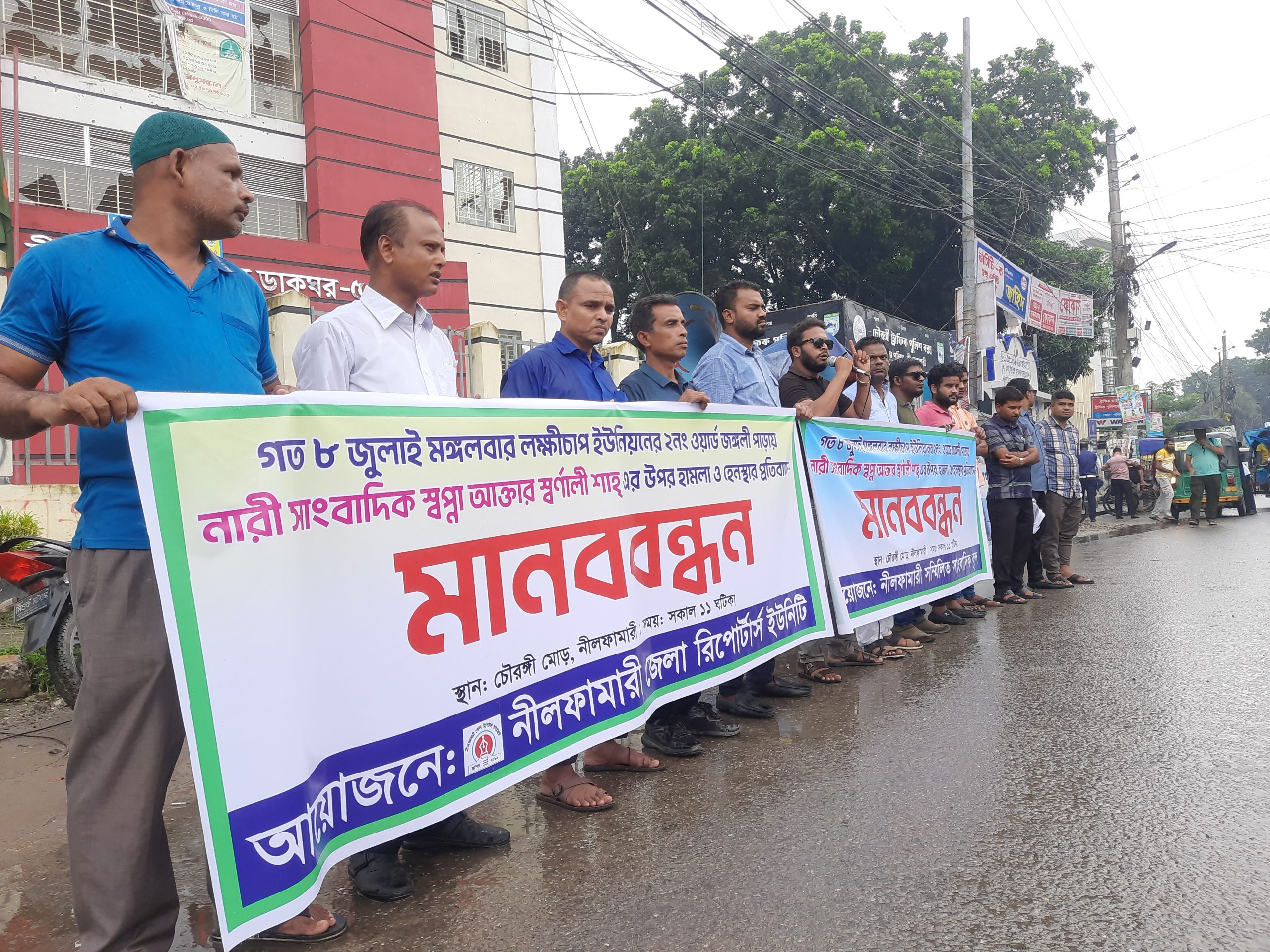 এই বর্বরোচিত ঘটনার প্রতিবাদে আজ বুধবার (১৬ জুলাই) সকাল ১১টায় নীলফামারী জেলা শহরের চৌরঙ্গী মোড়ে মানববন্ধনের আয়োজন করে “নীলফামারী জেলা রিপোর্টার্স ইউনিটি”। বৃষ্টি উপেক্ষা করে কর্মসূচিতে জেলার বিভিন্ন গণমাধ্যমের সাংবাদিক, সামাজিক সংগঠনের প্রতিনিধি ও সচেতন নাগরিকেরা অংশগ্রহণ করেন।