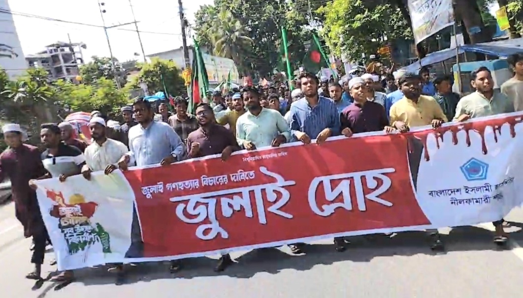 ২০২৪ সালের জুলাই মাসে সংঘটিত ‘গণহত্যার’ বিচার দাবিতে ‘জুলাই দ্রোহ’ কর্মসূচির আওতায় নীলফামারীতে বিক্ষোভ মিছিল ও সংক্ষিপ্ত সমাবেশ অনুষ্ঠিত হয়েছে। শুক্রবার (২৫ জুলাই) বিকেলে বাংলাদেশ ইসলামী ছাত্রশিবির, নীলফামারী জেলা শাখার উদ্যোগে আয়োজিত এ কর্মসূচিতে দলটির নেতাকর্মীরা ব্যানার, ফেস্টুন ও জাতীয় পতাকা হাতে অংশগ্রহণ করেন।